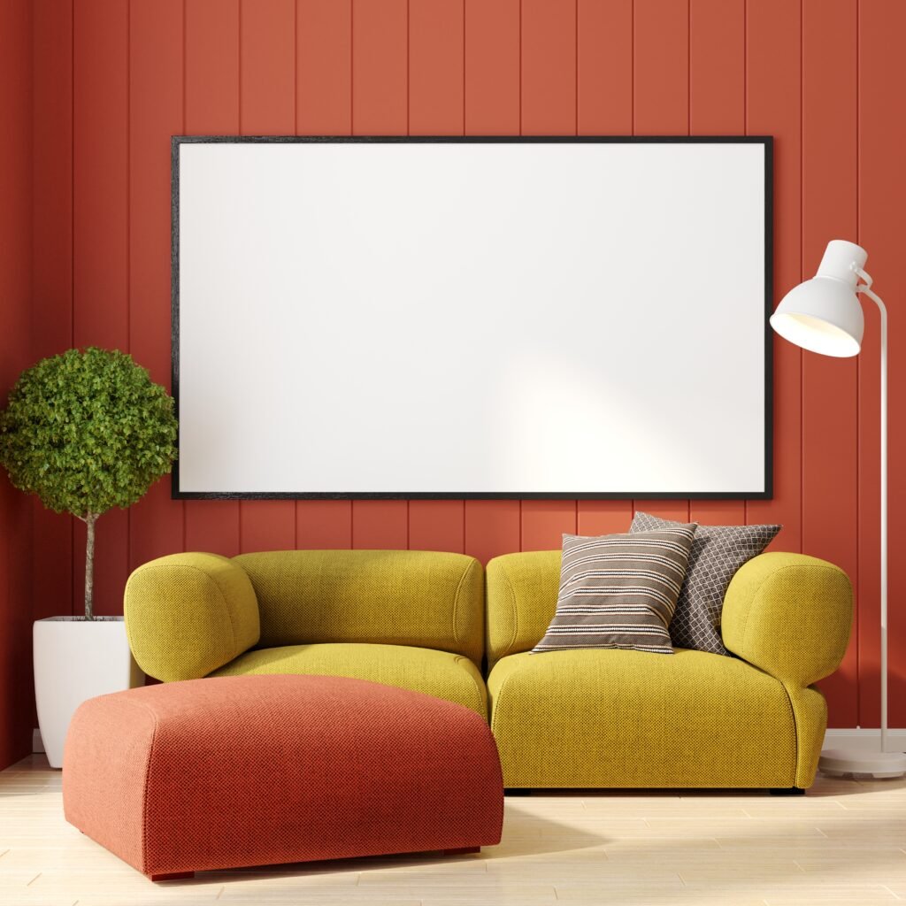 This interior design, a creation of Amrutha Interior Designers, showcases a striking balance of vibrant colors and minimalist style to create a cozy and inviting living space. The bold, terracotta-red wall serves as a powerful backdrop, accented by subtle vertical wood paneling that adds texture and depth to the room. Against this warm-toned wall, a plush, rounded yellow-green sofa with matching pillows and a contrasting orange-red ottoman provide a comfortable and stylish seating area, demonstrating a confident use of color blocking to define the space.